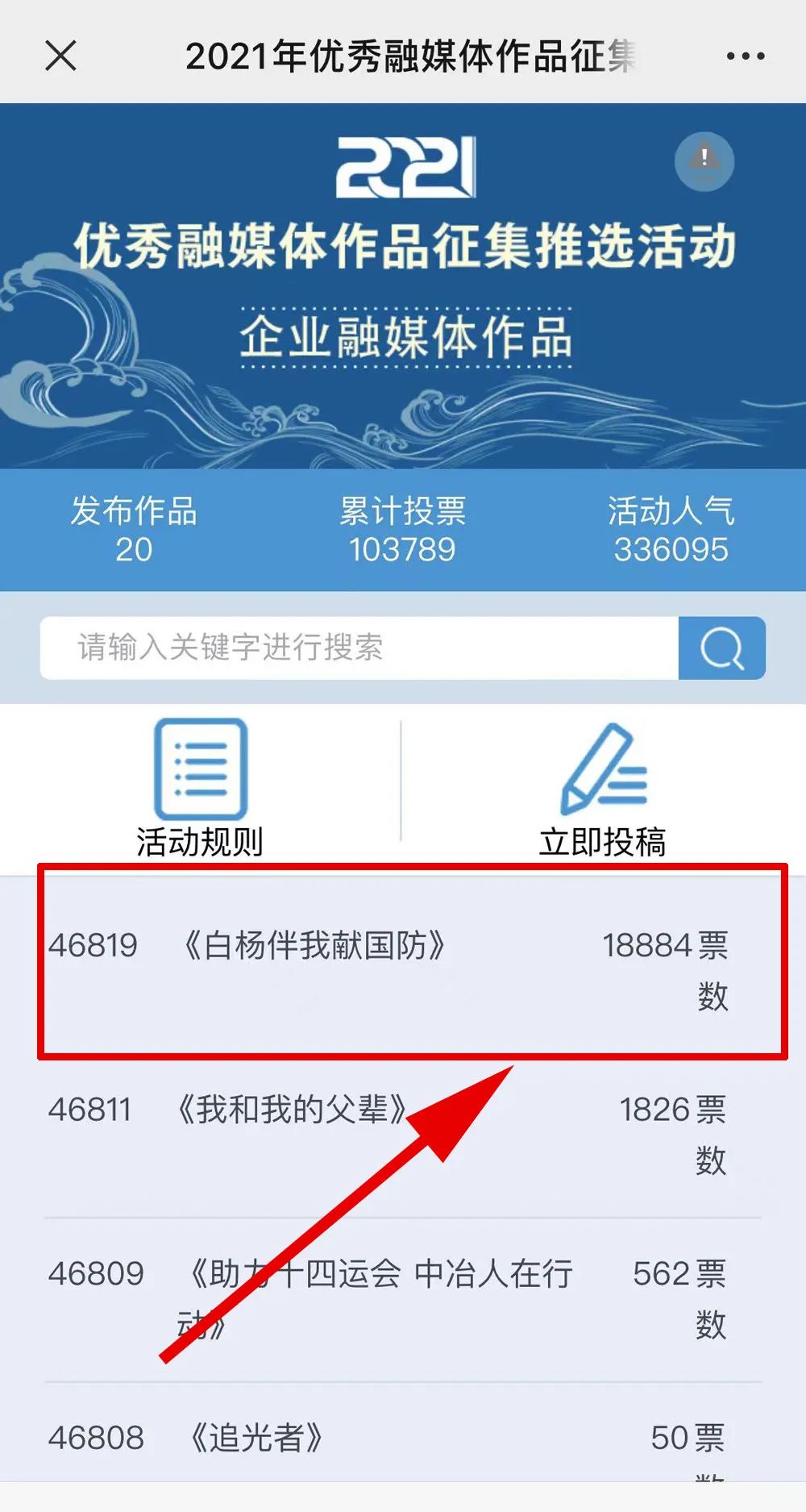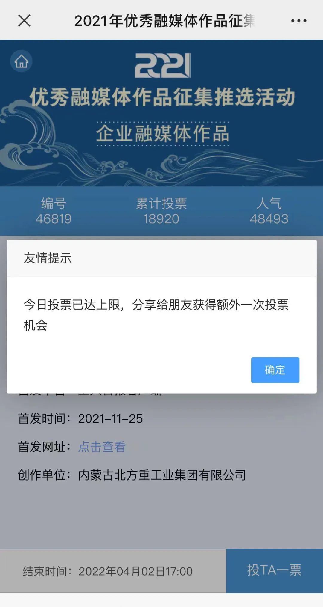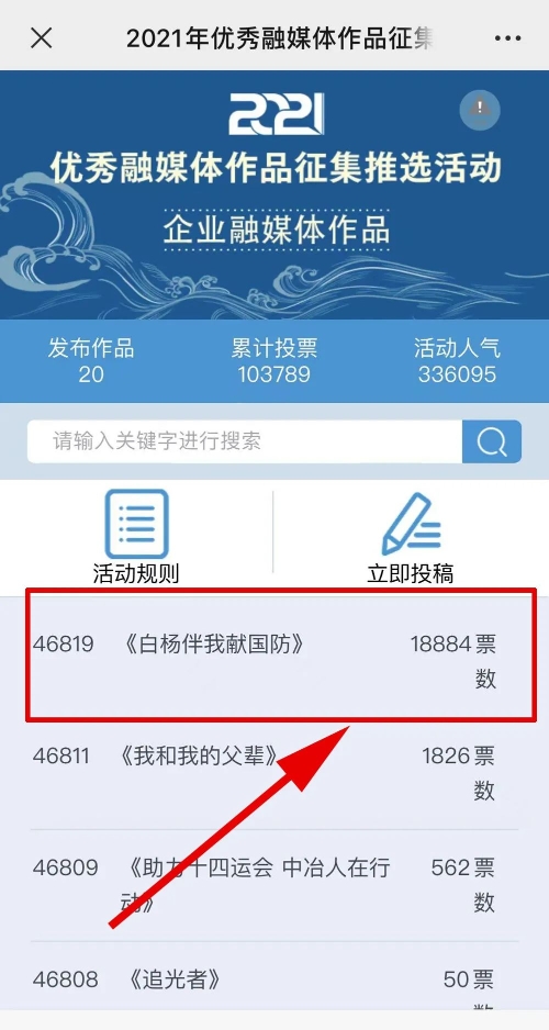 近日,由“文化強(qiáng)國(guó)”光明日?qǐng)?bào)協(xié)同推廣平臺(tái)、光明網(wǎng)、北京師范大學(xué)新媒體傳播研究中心和光明天翼5G融媒實(shí)驗(yàn)室共同主辦的“2021年優(yōu)秀融媒體作品征集推選活動(dòng)”開(kāi)啟線上投票環(huán)節(jié),經(jīng)過(guò)專家委員會(huì)評(píng)審,中國(guó)兵器工業(yè)集團(tuán)北重集團(tuán)《白楊伴我獻(xiàn)國(guó)防》音樂(lè)MV入選活動(dòng)前二十名,并進(jìn)入網(wǎng)絡(luò)投票環(huán)節(jié)。 《白楊伴我獻(xiàn)國(guó)防》 楊樹(shù)參天 高聳云端的是兵工人 “履行好強(qiáng)軍首責(zé)”的壯志凌云! 深植北疆 傾獻(xiàn)沃土的是北重人 “推動(dòng)高質(zhì)量發(fā)展”的壯志豪情! 白楊樹(shù)伴著我們茁壯成長(zhǎng) 見(jiàn)證著我們獻(xiàn)身國(guó)防! 投票方式 1.掃描下方二維碼,進(jìn)入初始界面,點(diǎn)擊“企業(yè)融媒體作品征集”,進(jìn)入投票界面點(diǎn)擊《白楊伴我獻(xiàn)國(guó)防》,點(diǎn)擊“投TA一票”; 2. 每人每日可投10票,直至提示投票達(dá)到上限即可; 3.投票時(shí)間:2022年3月17日09:00-2022年4月2日17:00。 來(lái)源/光明網(wǎng)、北重集團(tuán) |