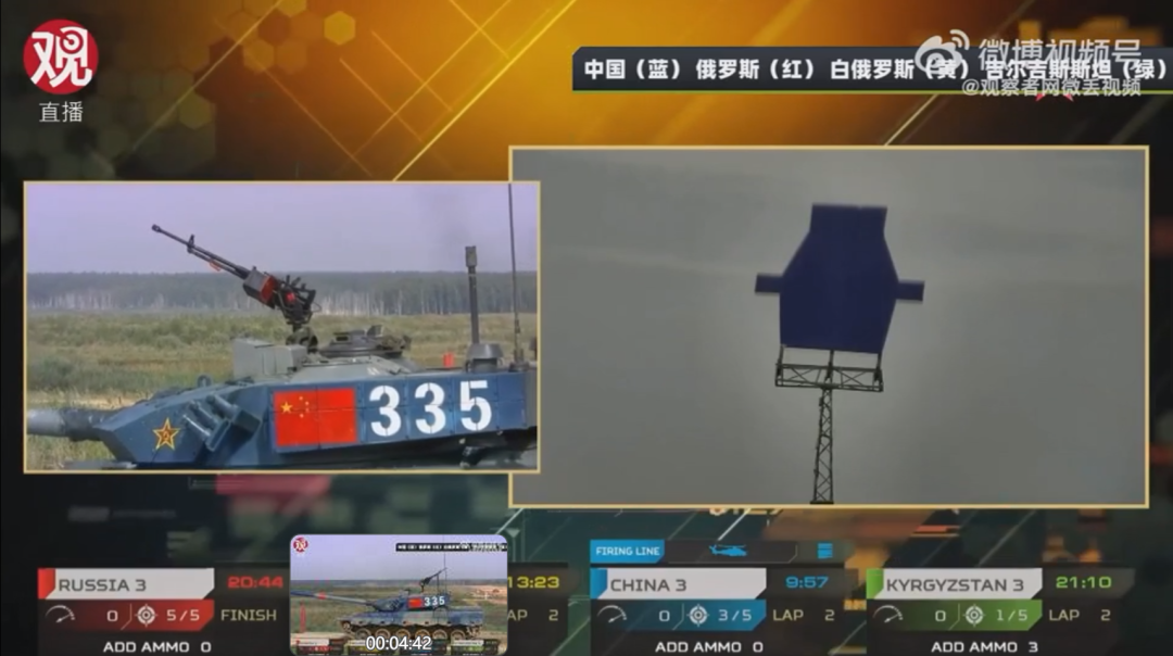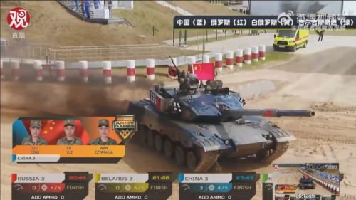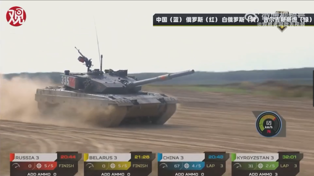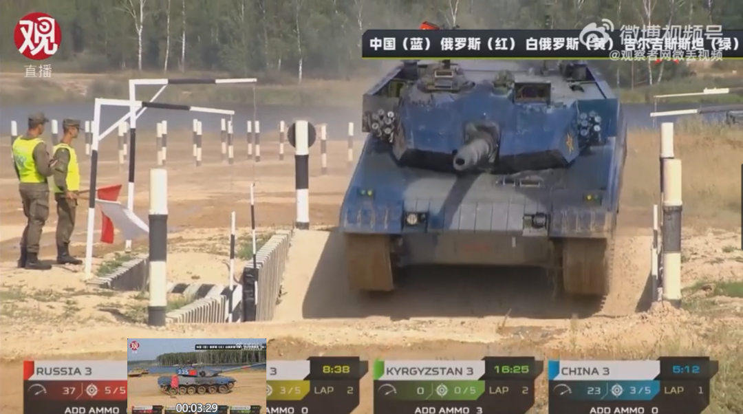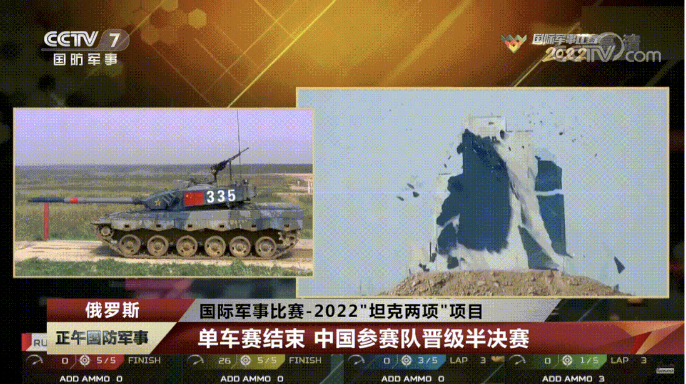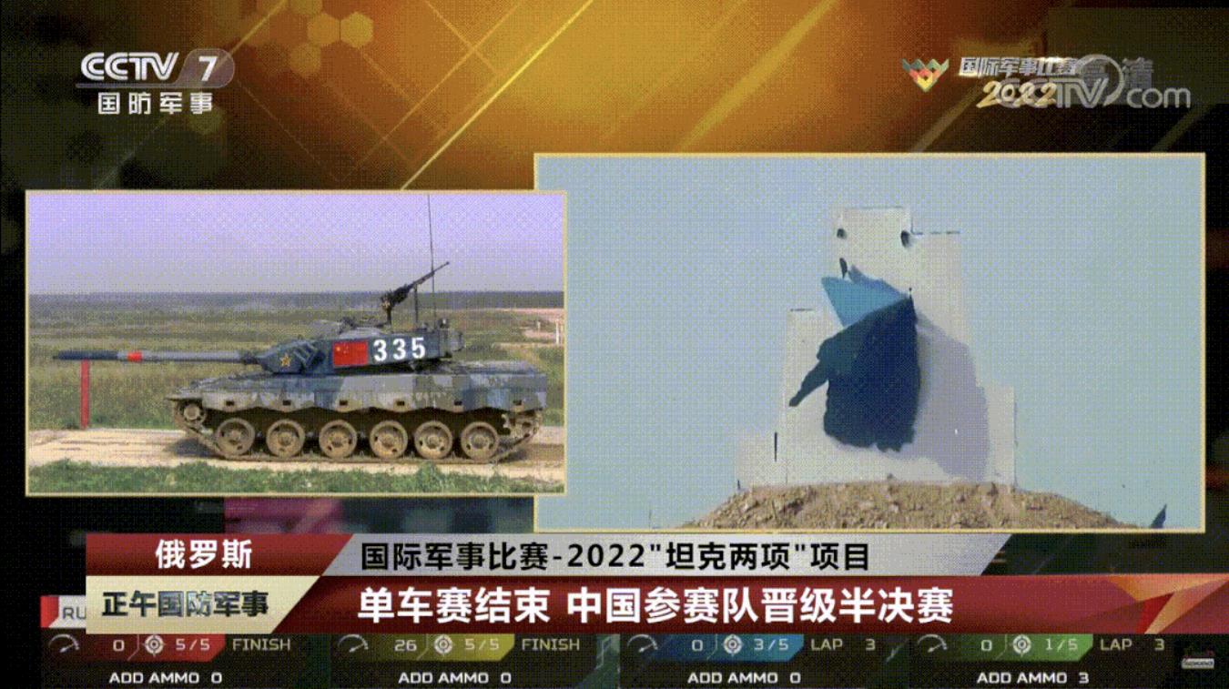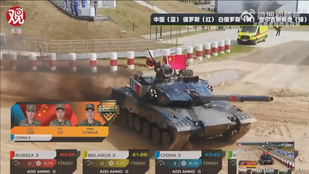 96B坦克助力中國(guó)隊(duì)挺進(jìn)“坦克兩項(xiàng)”半決賽 當(dāng)?shù)貢r(shí)間8月21日 “國(guó)際軍事比賽-2022” “坦克兩項(xiàng)”單車賽第三輪的比拼 在俄羅斯阿拉比諾拉開(kāi)帷幕 中國(guó)參賽隊(duì)駕駛96B坦克 發(fā)揮出色 在單車賽中 中國(guó)與白俄羅斯、俄羅斯、吉爾吉斯斯坦 分在同一組進(jìn)行比拼 比賽中 96B坦克全程發(fā)揮穩(wěn)定 一路疾馳通過(guò) 涉水場(chǎng)、土嶺、車轍橋等各類障礙 順利完成比賽 高射機(jī)槍命中 本屆“國(guó)際軍事比賽”“坦克兩項(xiàng)”項(xiàng)目 共有21個(gè)國(guó)家和地區(qū)的隊(duì)伍參加 中國(guó)參賽隊(duì) 335車組、334車組、336車組 分別取得第五、第八、第九名 以單車賽總評(píng)第二的成績(jī) 成功晉級(jí)半決賽